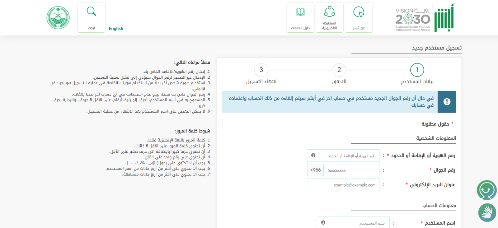 - يُطلب ملء البيانات الشخصية بعناية ودقة، مثل رقم الهوية وعنوان البريد الإلكتروني.