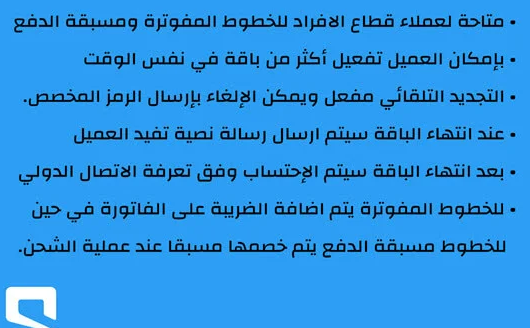 - عند انتهاء الباقة سوف يتم الاحتساب تبعًا لتعرفة الاتصال الدولي.