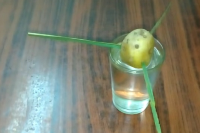 - ضع البطاطس في الكوب على أن تقوم أعواد الأسنان مسنودة على طرف الكوب بحيث يكون الثلث السفلي من الحبة في الماء والباقية أعلى الكوب.