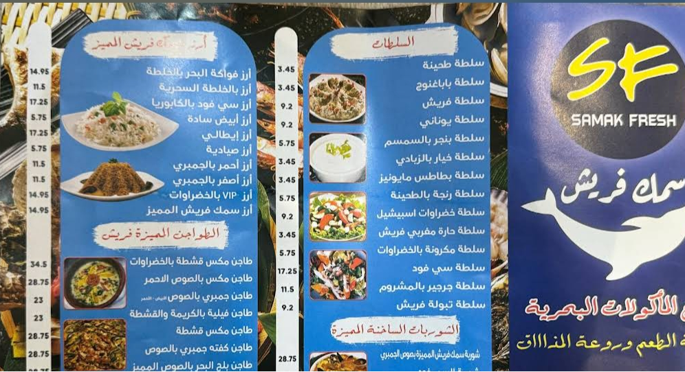 يعتبر مطعم سمك فريش تبوك من بين المطاعم المشهورة والمهمة التي توجد في تبوك بالمملكة العربية السعودية والذي يحوز على شهرة واسعة لما يقدمه من الكثير من الأنواع الطازجة من المأكولات البحرية والتي تكون في منتهى الروعة وبأسعار مناسبة، حيث يمكن الاطلاع على قائمة الطعام من خلال الآتي: