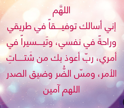 - اللهم ارزقني الراحة في عملي وتيسير الأمور التي أتخلص بها من مصاعب الحياة، اللهم أغنني بفضلك وكرمك ومالك الحلال، وابعدني عن الحرام ووساوس الشيطان يا رب العالمين.