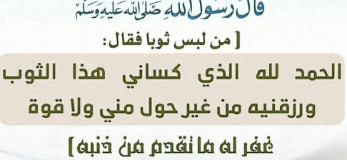 كان رسولُ اللهِ إذا استجدَّ ثوبًا سماهُ باسمِه إما قميصًا أو عمامةً ثمَّ يقولُ “اللهمَّ لك الحمدُ أنت كسوتَنيهِ أسألُكَ من خيرِه وخيرِ ما صُنعَ له وأعوذُ بكَ من شرِّه وشرِّ ما صُنِعَ لهُ” [رواه: أبو سعيد الخدري].