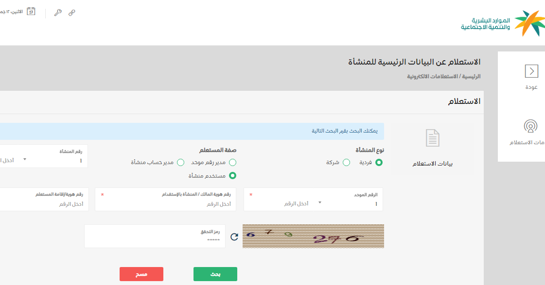 - املأ البيانات اللازمة (الرقم الموحد، ورقم هوية المالك، ورق هوية أو إقامة المستعلم).