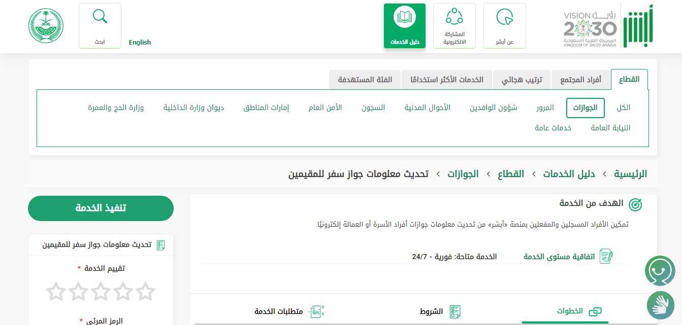 يمكن للمواطن المصري المقيم في السعودية تمديد جواز سفره من خلال منصة أبشر الرقمية التابعة لوزارة الداخلية، وذلك من خلال الخطوات التالية: