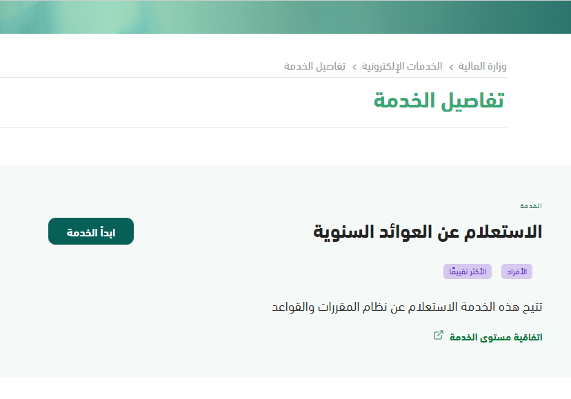 إن وزارة المالية في السعودية تقدم العديد من المعاملات الحكومية المهمة بشكل إلكتروني بسيط للتيسير على المستفيدين، ومن ضمنها خدمة الاستفسارات عن قيمة العائد السنوي، حيث إن يمكن الحصول على الخدمة بكل سلاسة من خلال النقر فوق رابط الاستعلام عن العوائد السنوية.