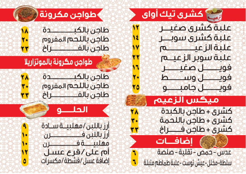 يقدم مطعم الزعيم للمشويات والمعجنات قائمة بأفضل الأكلات المصرية الأصيلة على مستوى عالي من الجودة والنظافة وبأفضل مذاق في مصر، حيث تشمل الوجبات الشهية بالمكونات الأسعار التالية: