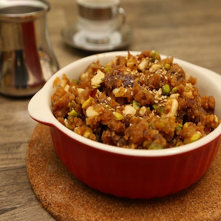 - إضافة كمية التمر مع السمسم والبهارات في الإناء والتقليب المستمر حتى تصبح عجين طري.