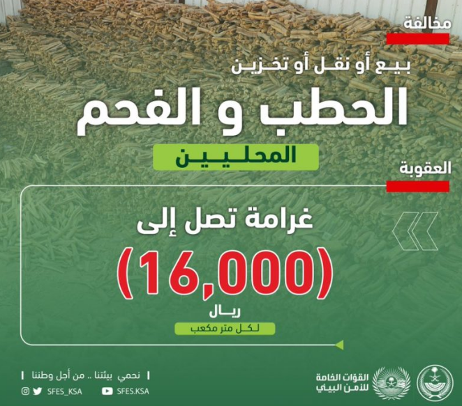 - يتم فرض غرامة مالية بقيمة 5 آلاف ريال سعودي في حالة قيام الشخص بنقل أو بيع أو تخزين الفحم أو الخشب من دون تصريح.