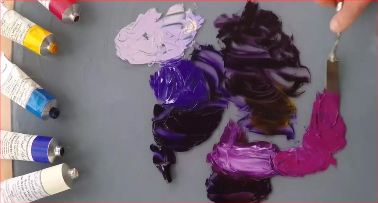 - حال وجدت لا زالت الألوان مُحتفظة بدرجاتها الغامقة، قم بوضع قليل من اللون الأبيض ثانيةً ولكن بشكل تدريجي، إلى أن تصل لدرجة البنفسجي الفاتح الذي تُريده.
