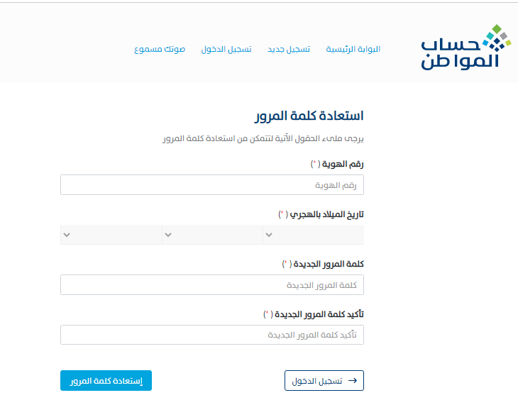 - املأ البيانات الآتية: (رقم الهوية، وتاريخ الميلاد بالهجري، وكلمة المرور الجديدة، وتأكيد كلمة المرور الجديدة).
