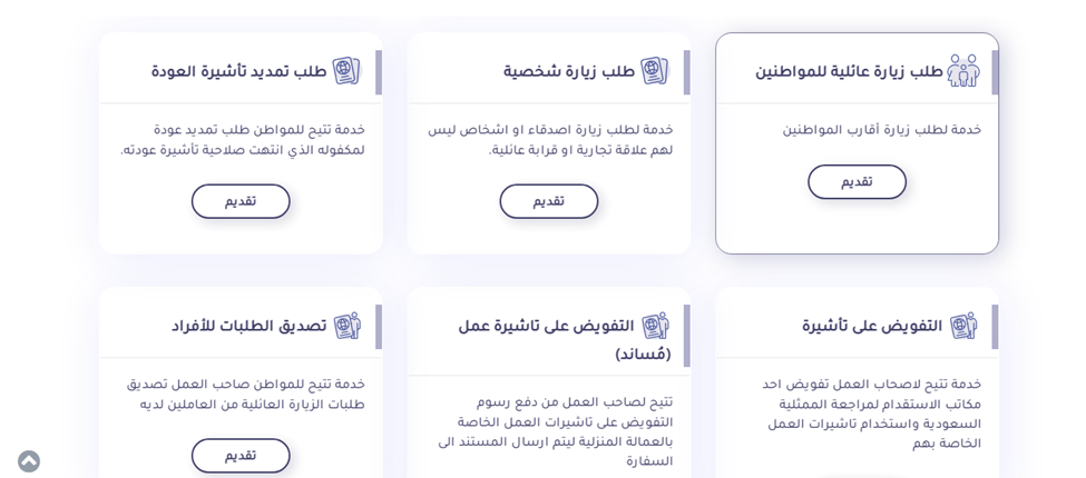يحق للمقيمين في المملكة العربية تقديم طلبات الزيارة إلى الأفراد والعائلة بصورة إلكترونية من خلال منصة التأشيرات وذلك عبر إجراء الآتي: