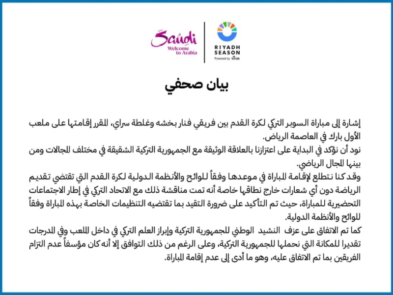 أصدر موسم الرياض بيان رسمي للتعليق على قرار إلغاء مباراة السوبر التركي التي كان من المقرر انعقادها أمس الجمعة والتي منعتها اللجنة المنظمة ومنعت مشجعي ولاعبي فريق غلاطة سراي من رفع أي شعارات سياسية، حيث جاء نص البيان كما يلي: