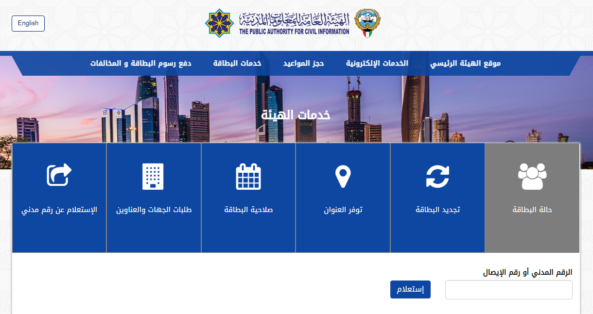 يمكن كذلك الاستعلام عن حالة البطاقة المدنية من خلال موقع الهيئة العامة للمعلومات المدنية، وذلك من خلال اتباع الخطوات التالية: