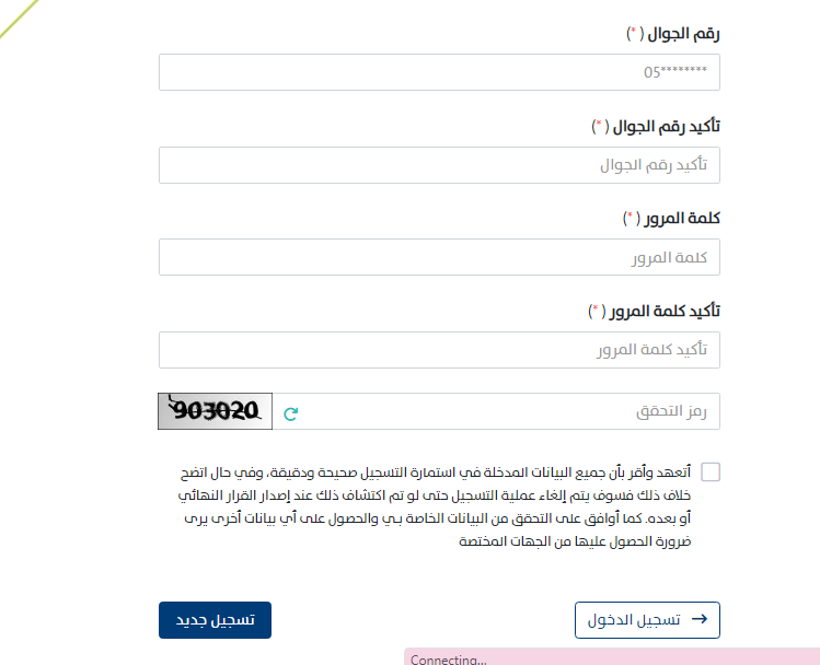 - سجل بيانات التسجيل (رقم الهوية، وتاريخ الميلاد بالهجري، ورقم الجوال، وتأكيد رقم الجوال، وكلمة المرور، وتأكيد كلمة المرور، ورمز التحقق).