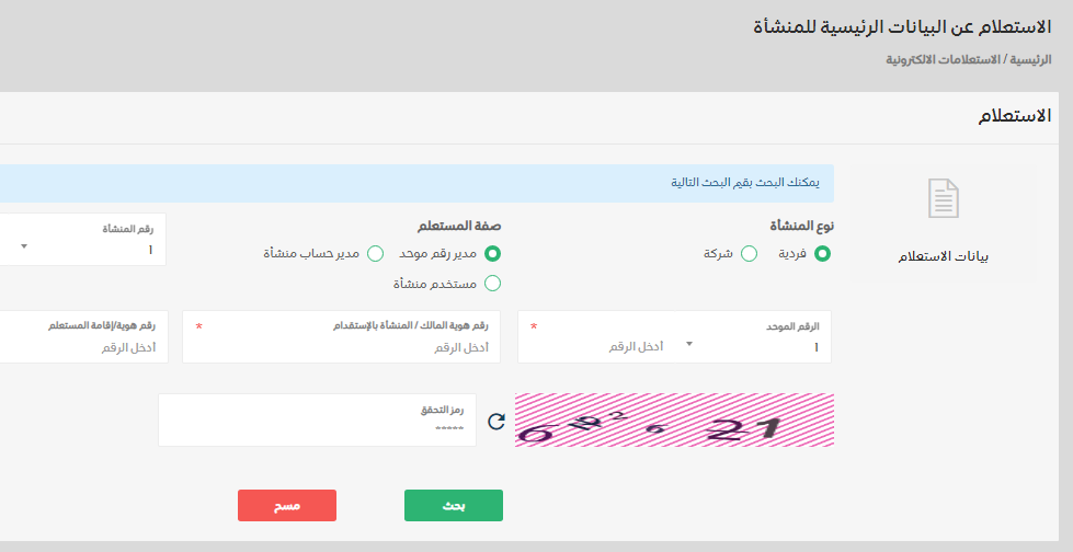 خطوات الاستعلام عن البيانات الرئيسية للمنشأة