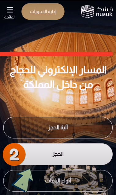 - اختيار المسار الإلكتروني للحجاج من داخل المملكة ثم تحديد خدمة الحجز.