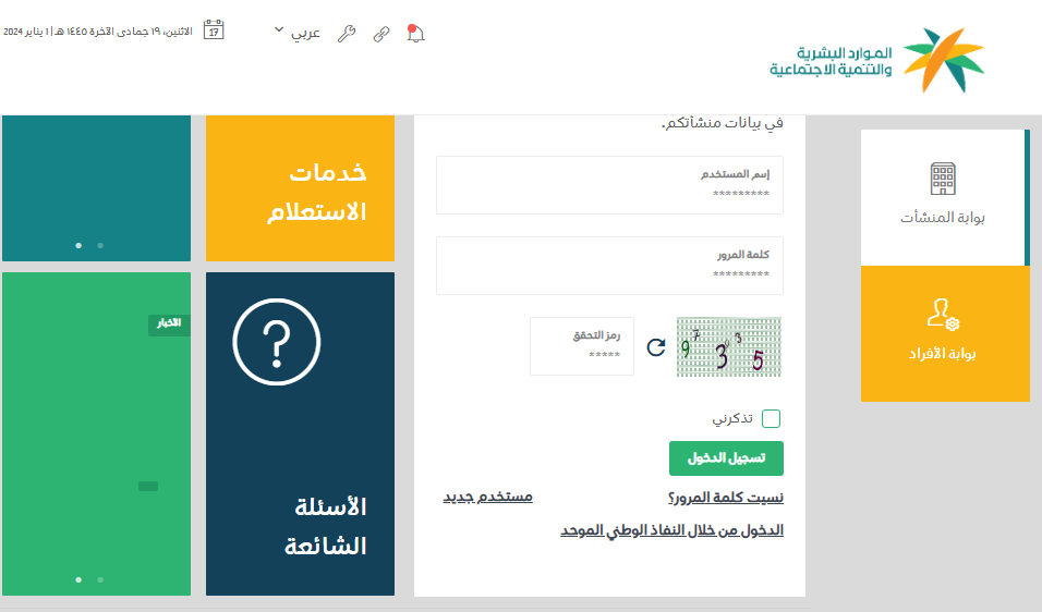 - يلي ذلك النقر على تسجيل الدخول والذي يتم عبر أدراج اسم المستخدم وكلمة المرور وكتابة رمز التحقق الظاهر على الشاشة.