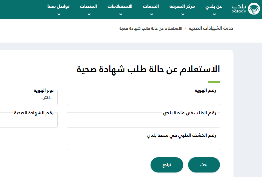 - سجل باقي بيانات الاستعلام (رقم الطلب في منصة بلدي، ورقم الشهادة الصحية، ورقم الكشف الطبي في بلدي).