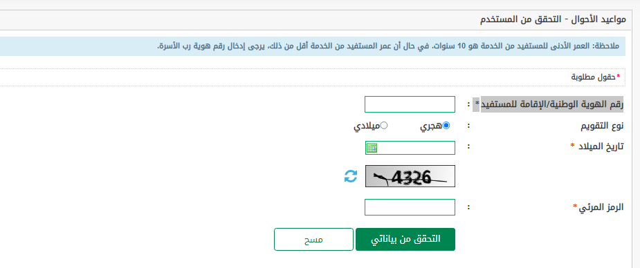 - ادخل بيانات الحجز (رقم الهوية الوطنية، أو رقم الإقامة، ونوع التقويم، وتاريخ الميلاد، والرمز المرئي).