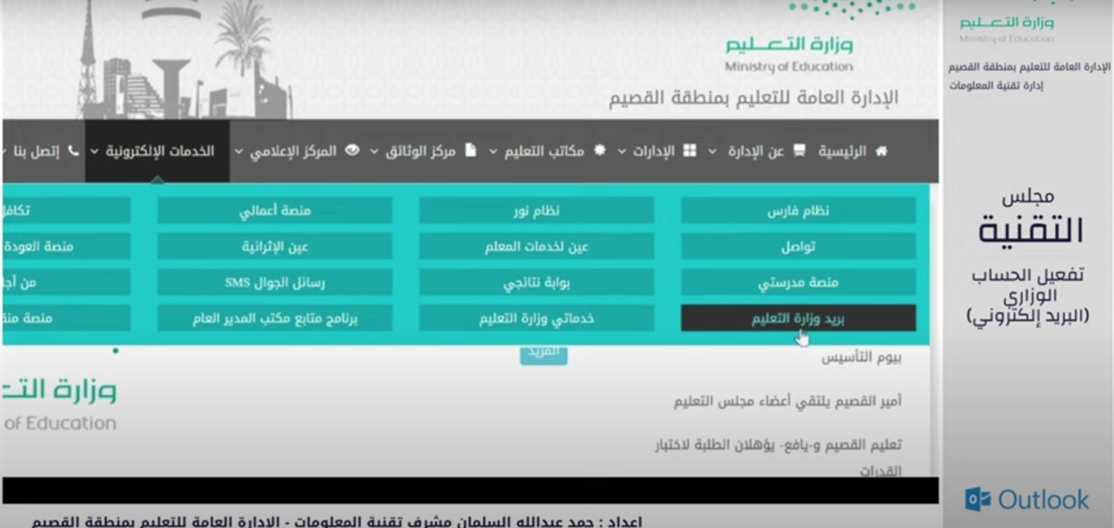 - النقر على الخدمات الإلكترونية، ومن ثم النقر على بريد وزارة التعليم كما هو ظاهر في الصورة أدناه.