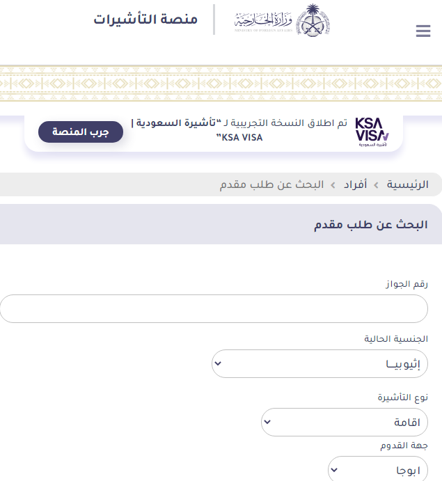 - تعيين نوع الاستعلام الخاص بطلب التأشيرة.