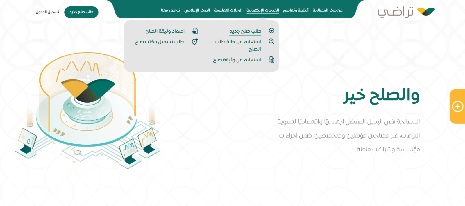 للأفراد الذين يسعون لحل نزاعاتهم والوصول إلى تسوية بطريقة سريعة وفعّالة، يُتيح لهم استخدام منصة تراضي الإلكترونية خيار تقديم طلب صلح باتباع الخطوات الإلكترونية التالية: