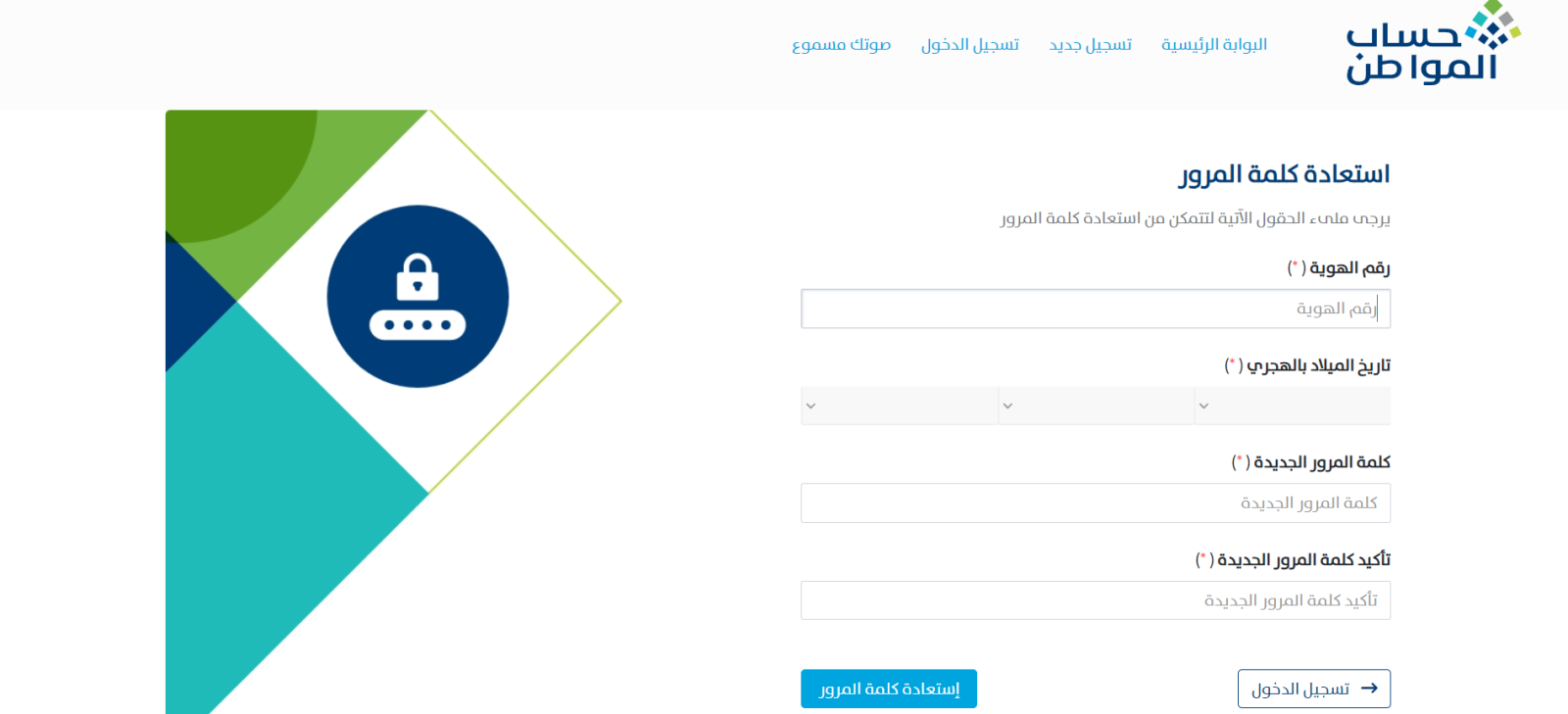 - يُطلب من المستخدم إدخال رقم الهوية الوطنية المرتبط بحسابه، بالإضافة إلى تاريخ الميلاد الهجري.