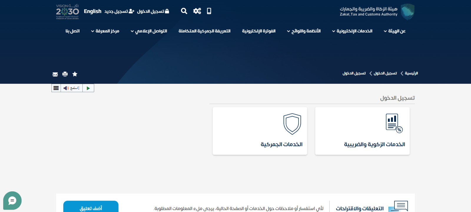 - قم بزيارة المنصة الرسمية الإلكترونية لهيئة الزكاة والضريبة والجمارك عبر الرابط المقدم.