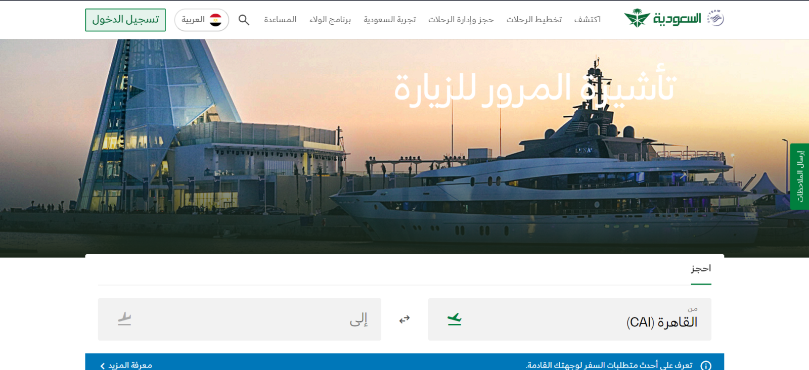 - تبدأ أولى الخطوات بزيارة الموقع الرسمي لخطوط الطيران السعودي.