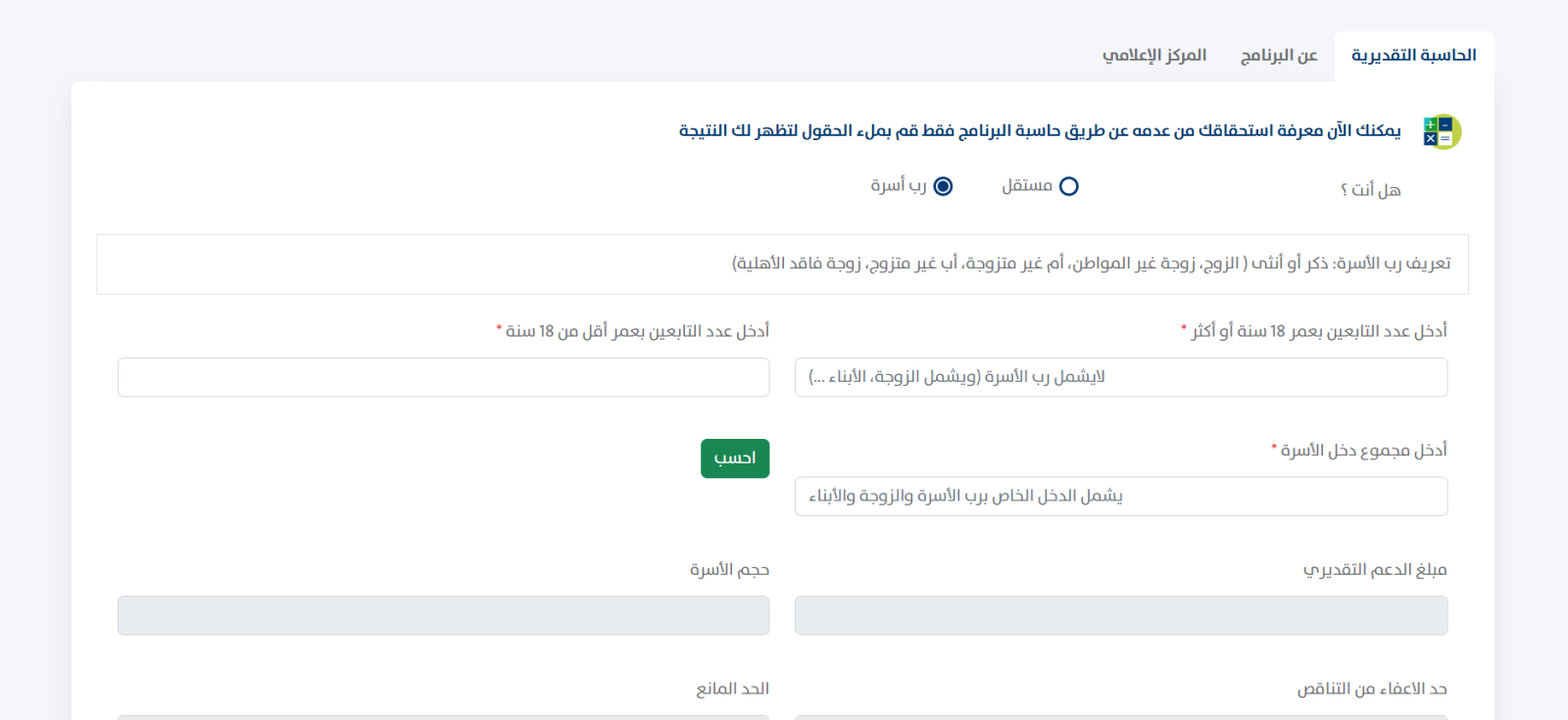 - انقر على زر "أحسب" ذي اللون الأخضر للحصول على تقدير لقيمة الدعم المستحقة.