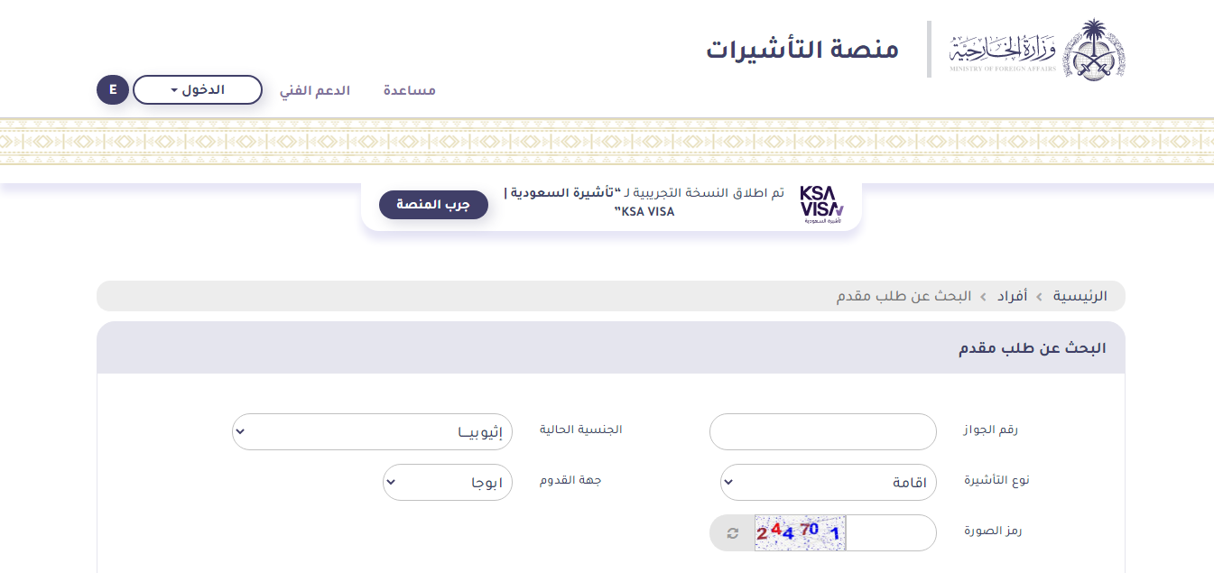 يمكن للأفراد المقيمين في المملكة العربية السعودية الاستعلام عن طلبات التأشيرات التي تم التقدم بها من قبل الأفراد، حيث يمكن الاستعلام من خلال رقم الطلب الذي تم استلامه.