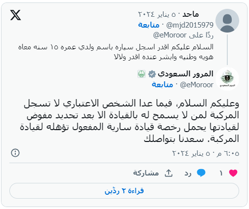 تلقى الحساب الرسمي للإدارة العامة للمرور السعودي عبر حسابه على منصة إكس تساؤل عن إمكانية تسجيل سيارة باسم قاصر عمره 15 عاماً و يحمل هوية وطنية، وكان الرد من قِبل إدارة المرور أنه لا يسمح بتسجيل السيارة لمن لا يحمل رخصة قيادة فيما عدا الشخص الاعتباري، إلا في حالة تحديد مفوض لقيادتها يحمل رخصة قيادة سارية المفعول ومؤهل لقيادة المركبة.