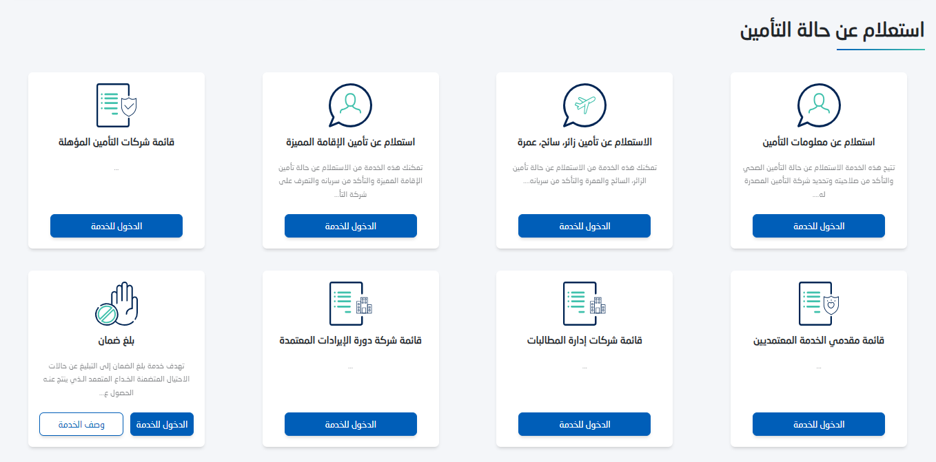 كما أتاحت منصة مجلس الضمان الطبي القدرة على الاستعلام عن تأمين الوافدين من أجل ضمان توفير جميع الخدمات الطبية لهم، ويجب مراعاة أنه لا يمكن تجديد إقامة أي وافد أو إصدار تأشيرة للخروج أو العودة دون اثبات التأمين الطبي، ويمكن الاستعلام عن حالة التأمين الطبي للوافدين عبر اتباع الخطوات التالية: