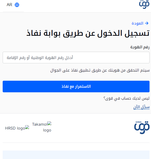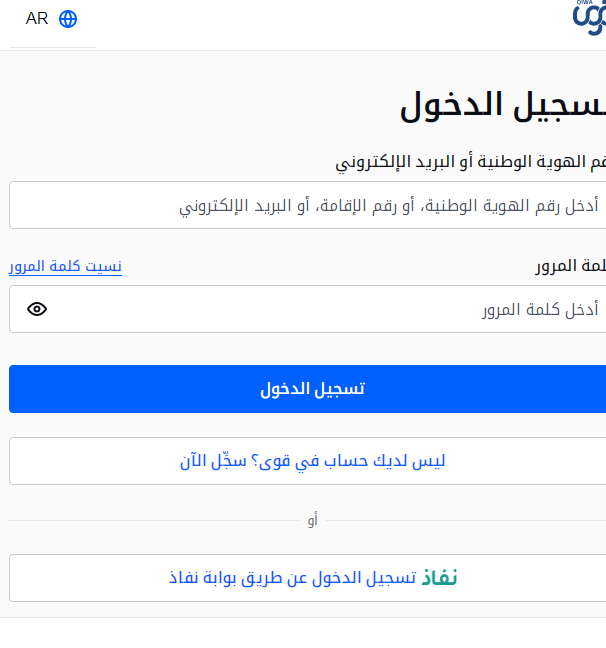 - يتم تسجل الدخول وذلك من خلال رقم الإقامة أو البريد الإلكتروني أو رقم الهوية الوطنية ثم كلمة المرور.