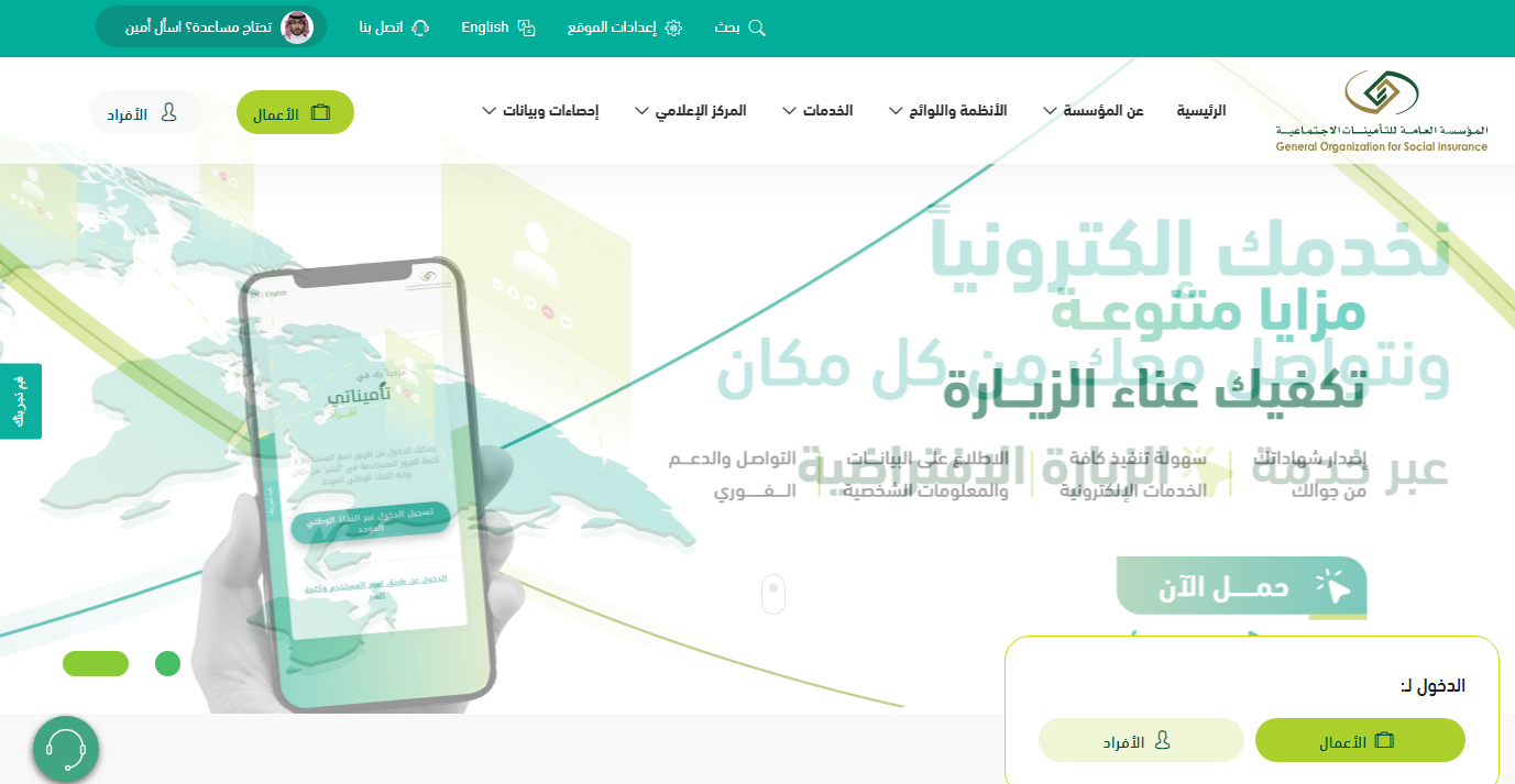 - الذهاب إلى الموقع الرسمي الخاص بالمؤسسة العامة للتأمينات الاجتماعية.