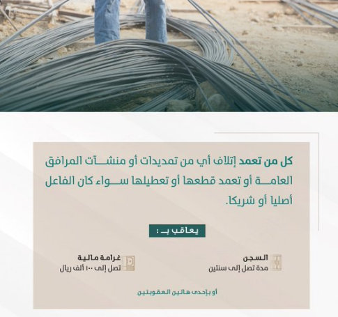 حيث أوضحت: "أن كل من تعمد إتلاف أي من تمديدات أو منشآت المرافق العامة أو تعمد قطعها أو تعطيلها سواء كان الفاعل أصليا أو شريكا، يعاقب بالسجن مدة تصل إلى سنتين وغرامة مالية تصل إلى 100 ألف ريال أو بإحدى هاتين العقوبتين".
