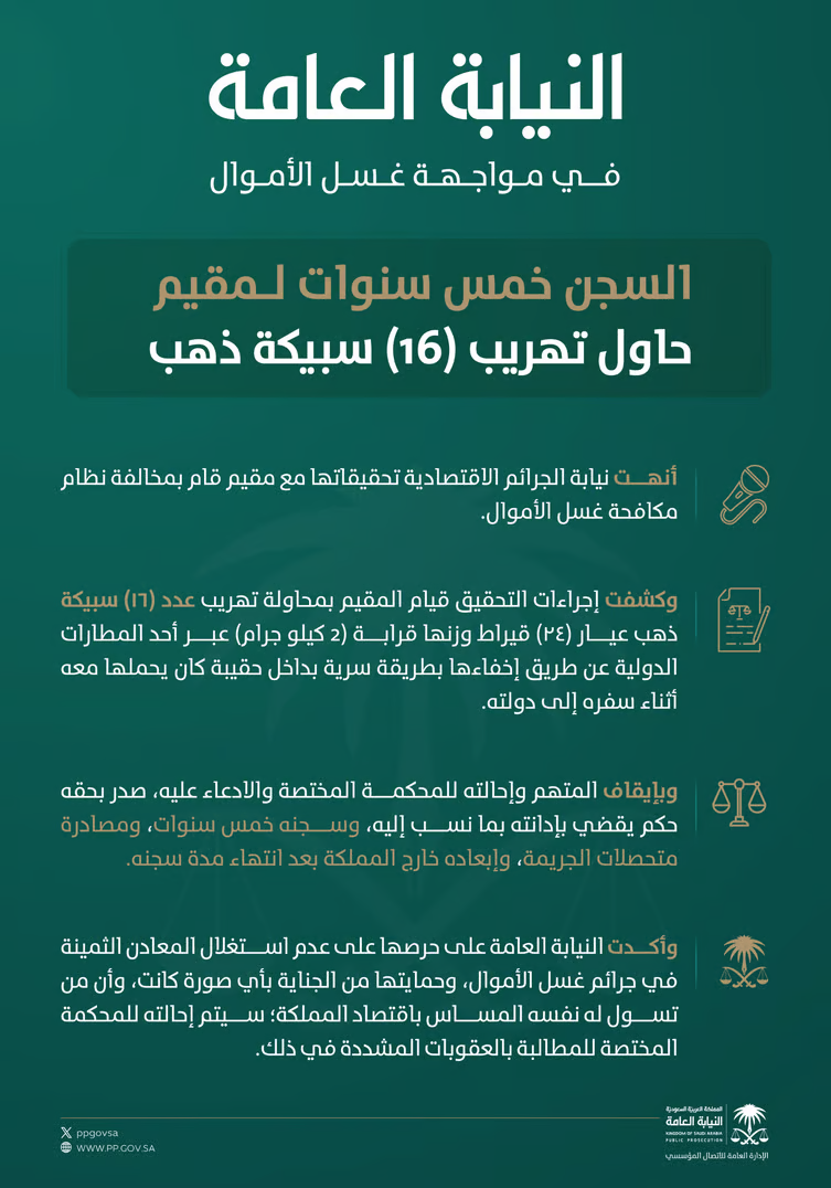 استطاعت النيابة العامة القبض على مقيم والإعلان عن الحكم بسجنه لمدة 5 سنوات، وذلك بعد أن حاول تهريب 16 سبيكة ذهب، وقد كان هذا بعد أن أنهت نيابة الجرائم الاقتصادية التحقيق مع مقيم قد قام بمخالفة نظام مكافحة غسل الأموال.