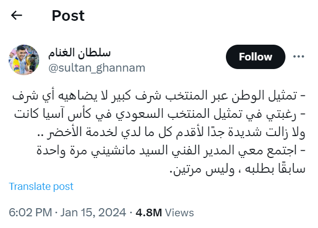 خرج سلطان الغنام في تدوينة على منصة أكس يوضح بها أن تمثيل الوطن في منتخب شرف كبير لا مثيل له وشدد على رغبته الشديدة في تمثيل المنتخب السعودي في كأس آسيا والتي كانت ولا زالت شديدة جدًا إذ إن حلمه هو تقديم كل ما ليده للأخضر.