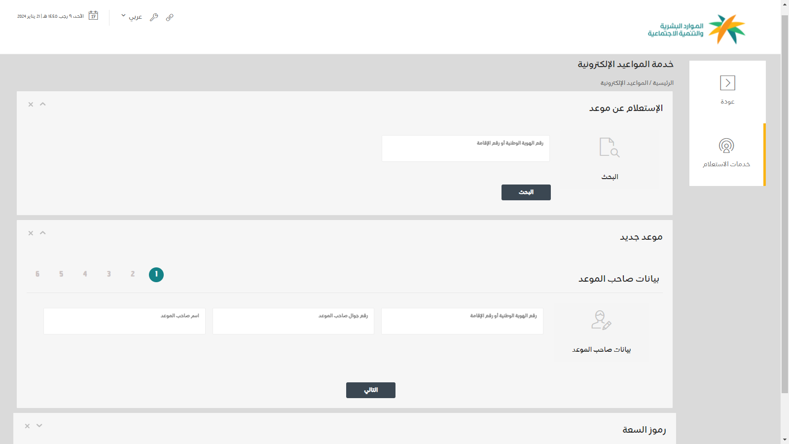 - قم بإدراج بيانات صاحب الموعد من رقم الهوية أو الإقامة ورقم الجوال والاسم.