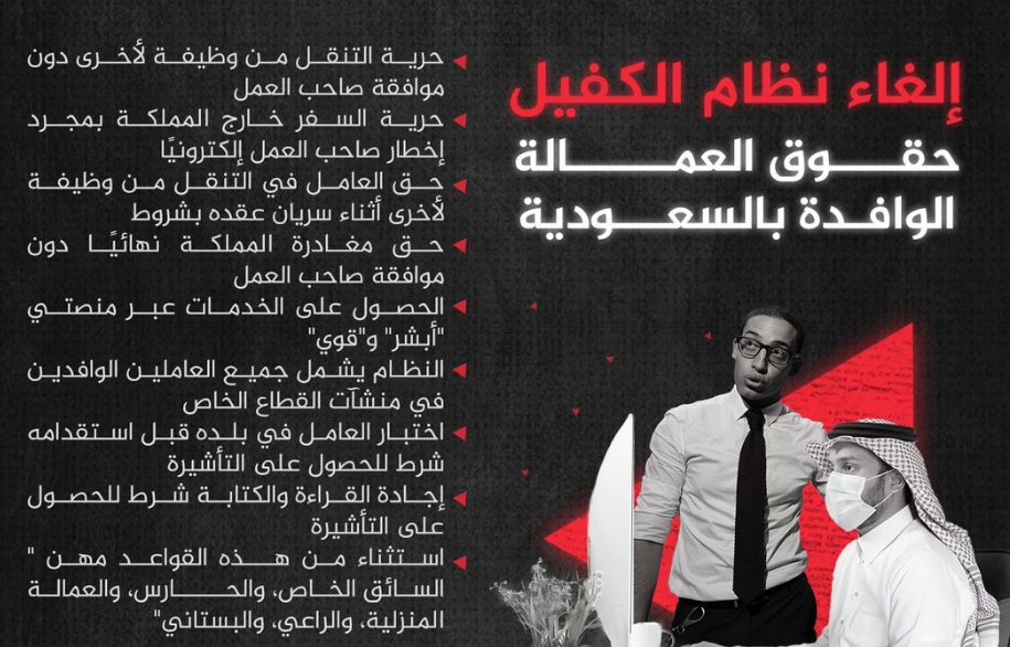 - حرية الانتقال الوظيفي؛ وهي التي تضمن للعامل إمكانية الانتقال إلى عمل جديد دون موافقة الكفيل في حال انتهى العقد، بل يمكن قبل انتهاء مدة التعاقد طبقًا لضوابط يحددها النظام.