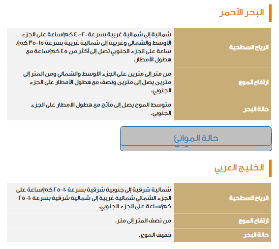 وإن هناك احتمالات نشاط رياح سطحية تعيق مجال الرؤية الأفقية وذلك على الرياض والأجزاء الشمالية من المنطقة الشرقية مع عدم استبعاد تكون ضباب على أجزاء المنطقة الشرقية في حين يستمر على مرتفعات جازان وعسير والباحة وتمتد إلى الطائف.