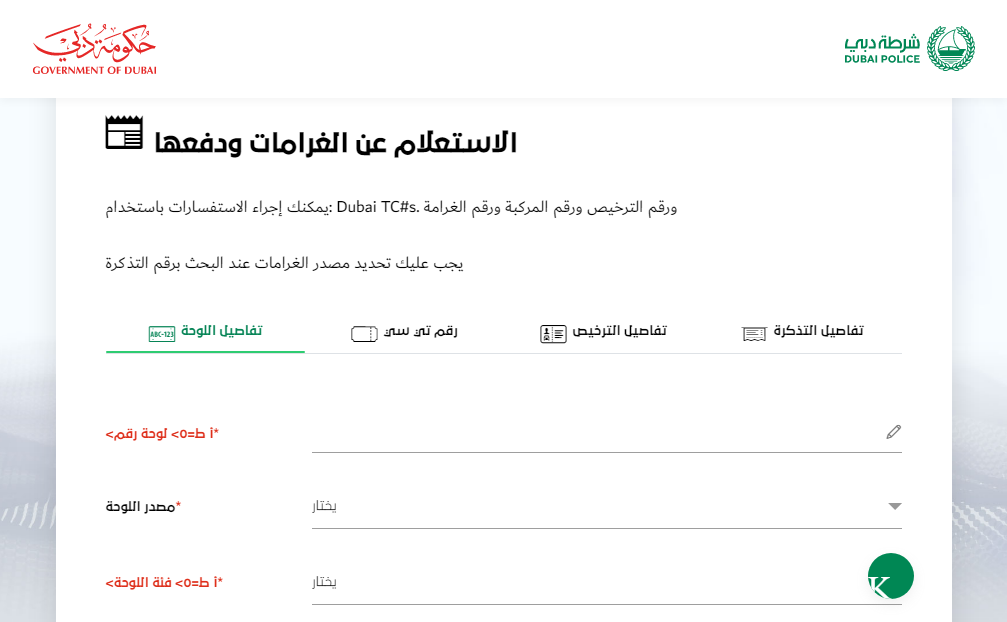 1- الاستعلام عن المخالفات المرورية برقم اللوحة دبي