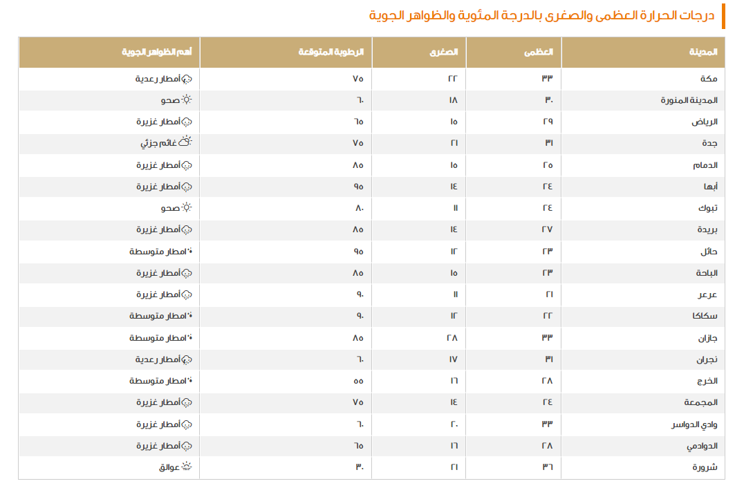 إذ بدأ سلسلة التنويهات من الرياح التي نشاطها في ازدياد مما ينعكس على هبوب العواصف الترابية والعوالق، كذلك زخات البرد تشهدها نجران، مكة المكرمة، الجوف، القصيم، عسير وغيرها والتي تكون مصاحبة للأمطار الرعدية، وأخيرًا تأتي درجات الحرارة التي تم رصدها أنها مستمرة في الانخفاض كما يلي: