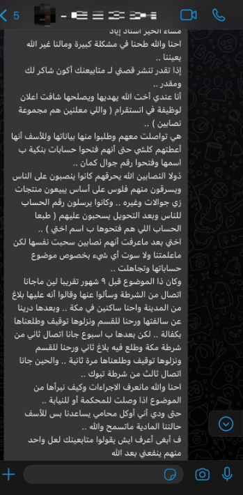 وأكمل: "النصابين فتحوا حسابات بنكية باسم أختها ورقم جوال كذلك باسمها، فكان هؤلاء النصابين يوهمون الناس ببيع منتجات ويرسلون رقم حسابها لهم وبعد التحويل "يسحبون عليهم".