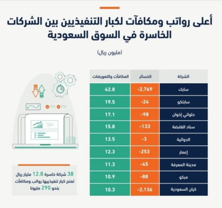 قامت 38 شركة سعودية بخسارة مجموعة من الرواتب والمكافآت لكبار المنفذين بها وهذا وصل إلى 290 مليون ريال في عام 2023 وهذا على الرغم من تسجيل خسائر 12.8 مليار ريال.