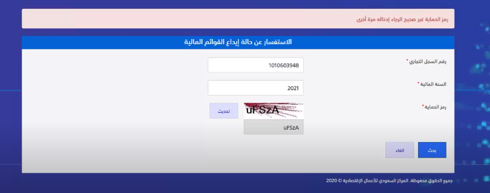 - سجل بيانات الاستعلام التالية: رقم السجل التجاري، والسنة المالية، ورمز التحقق.