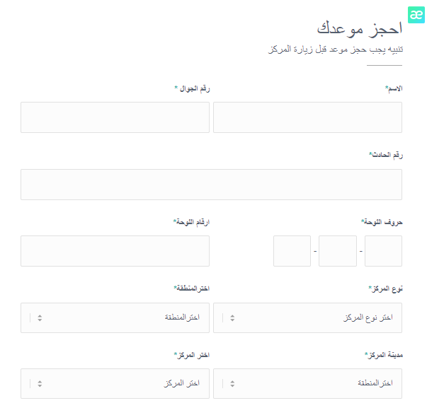- تعبئة أرقام اللوحة ونوع المركز واختيار المنطقة.