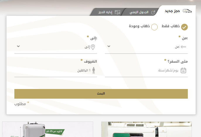- قم بتسجيل بيانات الحجز: مكان المغادرة، ومكان العودة، والتاريخ، وعدد الركاب.