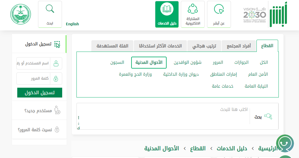 - من قائمة القطاعات المنسدلة، اختيار قطاع الأحوال المدنية.