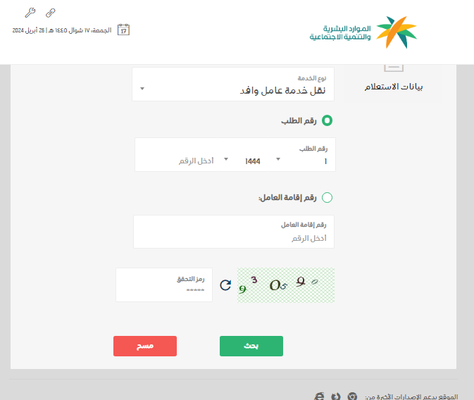 - اختر من خيارات الاستعلام نقل خدمة عامل وافد.